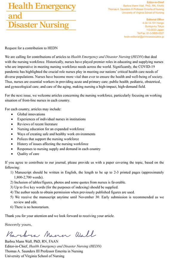 Until August 2017, the Health Emergency and Disaster Nursing (HEDN) journal has been available online free of charge from this website. As of September 2017, all current and back issues will now be available from the HEDN page on the website of J-Stage (Japan Science and Technology Information Aggregator, Electronic). This change will provide more effective dissemination and higher visibility for the HEDN Journal, and will attract more authors who wish to present their research internationally.